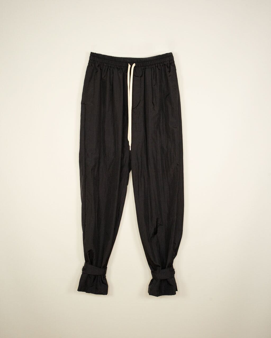 HEM RIBBON PANTS <LZE-PT04> ウォッシャブルナイロンを使用した軽いイージーパンツ 裾のベルトを巻きつけて、シルエットに変化がつけられる 透け防止の裏地付き 【COLOR】 DARK NAVY 【SIZE】 SIZE1 パンツ丈 94cm ウエスト寸 65cm 【MATERIAL】 表地/ナイロン100% 裏地/キュプラ100%