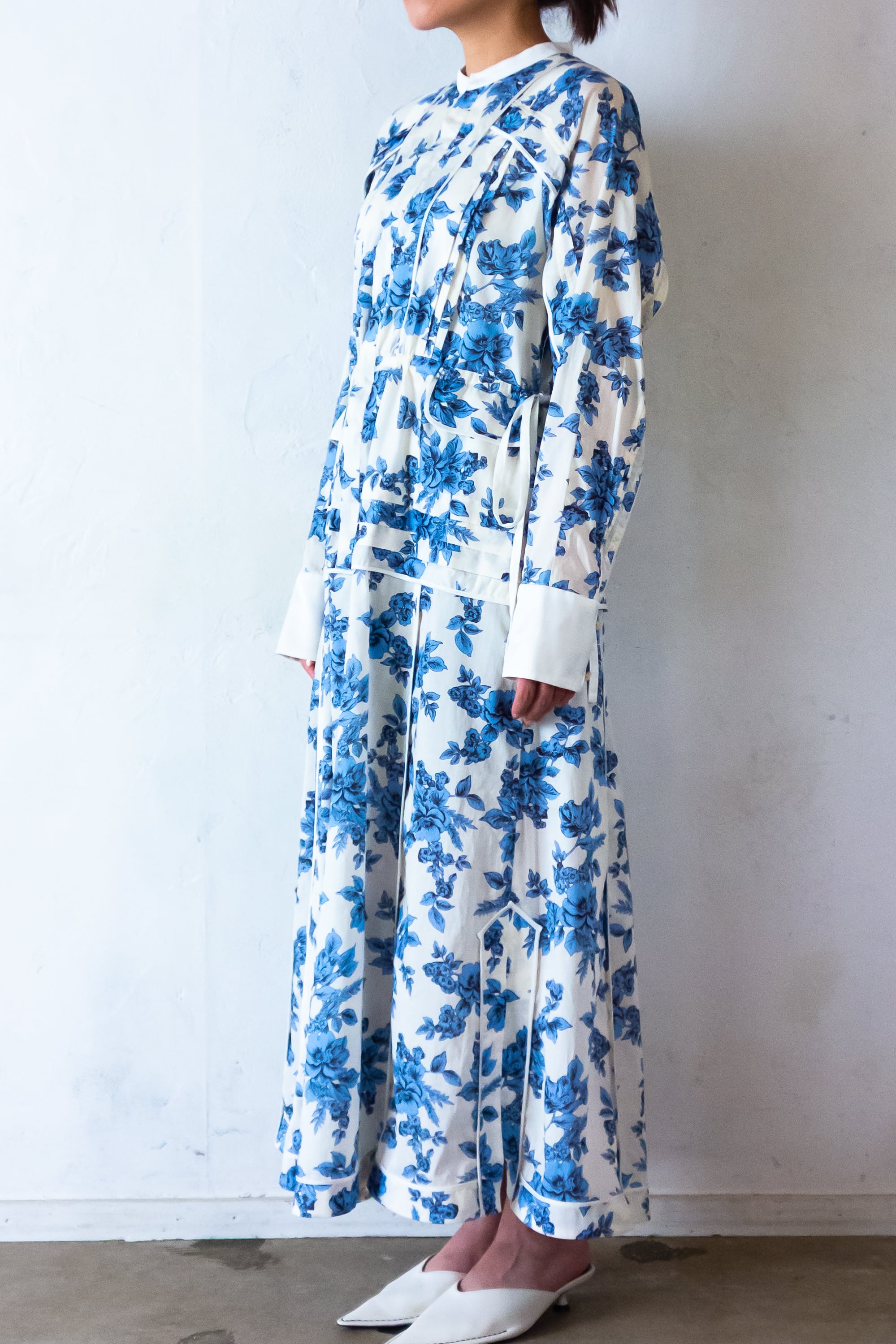 オリジナル花柄をプリントした薄手のコットンタイプライターを使用したシャツワンピース。